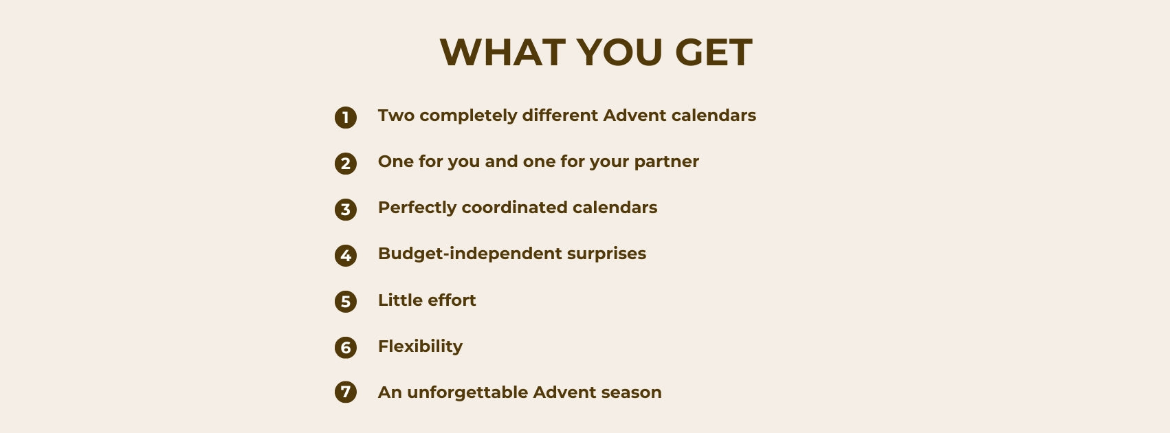 You will receive not just one but two different, perfectly coordinated Advent calendars: one for you and one for your partner. If you are an adventurous couple, take a look at our bundles.